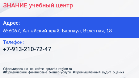 ЗНАНИЕ, учебный центр по адресу 656067, Алтайский край, Барнаул, Взлётная, 18 в дальнейшем Организация, размещена в следующих категориях: