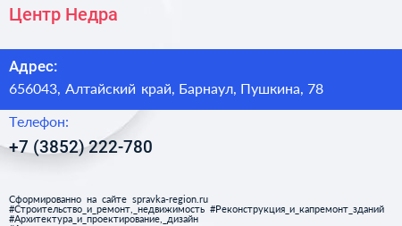 Центр-Недра по адресу 656043, Алтайский край, Барнаул, Пушкина, 78 в дальнейшем Организация, размещена в следующих категориях: