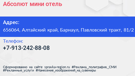 Абсолют, мини-отель по адресу 656064, Алтайский край, Барнаул, Павловский тракт, 81/2 в дальнейшем Организация, размещена в следующих категориях: