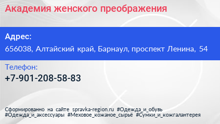 Академия женского преображения по адресу 656038, Алтайский край, Барнаул, проспект Ленина, 54 в дальнейшем Организация, размещена в следующих категориях: