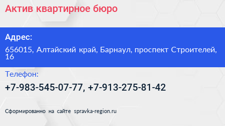 Актив, квартирное бюро по адресу 656015, Алтайский край, Барнаул, проспект Строителей, 16 в дальнейшем Организация, размещена в следующих категориях:
