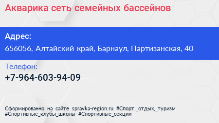 Акварика, сеть семейных бассейнов по адресу 656056, Алтайский край, Барнаул, Партизанская, 40 в дальнейшем Организация, размещена в следующих категориях: