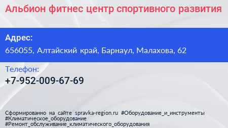 Альбион-фитнес, центр спортивного развития по адресу 656055, Алтайский край, Барнаул, Малахова, 62 в дальнейшем Организация, размещена в следующих категориях: