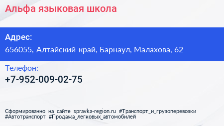 Альфа, языковая школа по адресу 656055, Алтайский край, Барнаул, Малахова, 62 в дальнейшем Организация, размещена в следующих категориях: