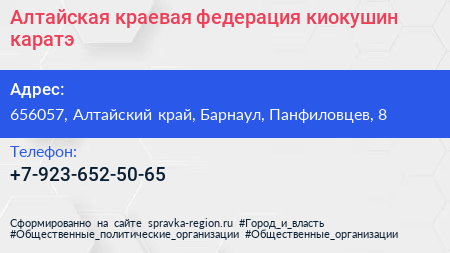 Алтайская краевая федерация киокушин каратэ по адресу 656057, Алтайский край, Барнаул, Панфиловцев, 8 в дальнейшем Организация, размещена в следующих категориях: