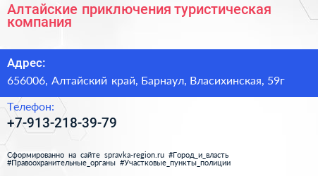 Алтайские приключения, туристическая компания по адресу 656006, Алтайский край, Барнаул, Власихинская, 59г в дальнейшем Организация, размещена в следующих категориях:
