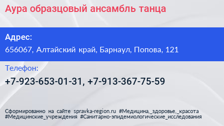 Аура, образцовый ансамбль танца по адресу 656067, Алтайский край, Барнаул, Попова, 121 в дальнейшем Организация, размещена в следующих категориях:
