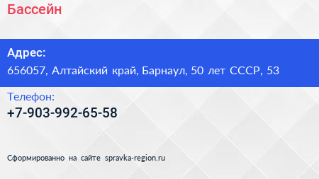 Бассейн по адресу 656057, Алтайский край, Барнаул, 50 лет СССР, 53 в дальнейшем Организация, размещена в следующих категориях: