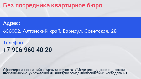 Без посредника, квартирное бюро по адресу 656002, Алтайский край, Барнаул, Советская, 28 в дальнейшем Организация, размещена в следующих категориях: