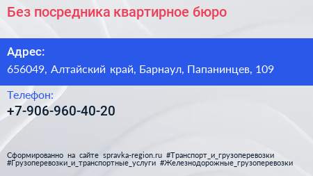 Без посредника, квартирное бюро по адресу 656049, Алтайский край, Барнаул, Папанинцев, 109 в дальнейшем Организация, размещена в следующих категориях: