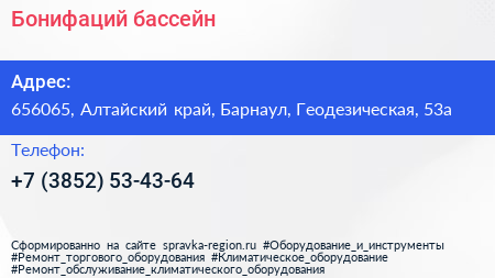Бонифаций, бассейн по адресу 656065, Алтайский край, Барнаул, Геодезическая, 53а в дальнейшем Организация, размещена в следующих категориях: