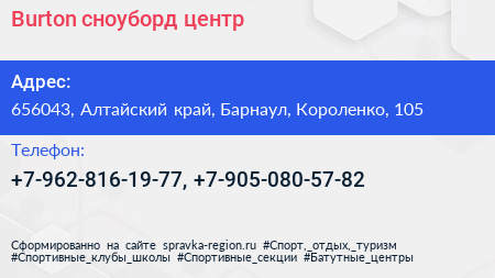 Burton, сноуборд-центр по адресу 656043, Алтайский край, Барнаул, Короленко, 105 в дальнейшем Организация, размещена в следующих категориях: