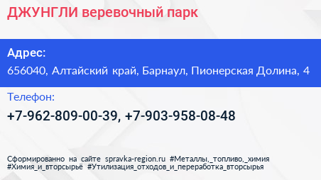 ДЖУНГЛИ, веревочный парк по адресу 656040, Алтайский край, Барнаул, Пионерская Долина, 4 в дальнейшем Организация, размещена в следующих категориях:
