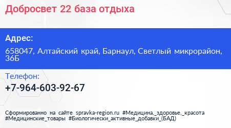 Добросвет 22, база отдыха по адресу 658047, Алтайский край, Барнаул, Светлый микрорайон, 36Б в дальнейшем Организация, размещена в следующих категориях: