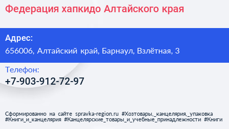 Федерация хапкидо Алтайского края по адресу 656006, Алтайский край, Барнаул, Взлётная, 3 в дальнейшем Организация, размещена в следующих категориях: