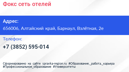 Фокс, сеть отелей по адресу 656006, Алтайский край, Барнаул, Взлётная, 2е в дальнейшем Организация, размещена в следующих категориях: