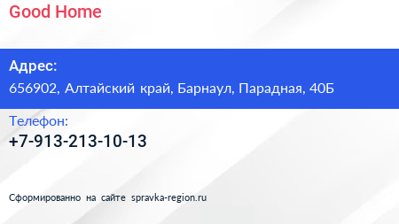 Good Home по адресу 656902, Алтайский край, Барнаул, Парадная, 40Б в дальнейшем Организация, размещена в следующих категориях: