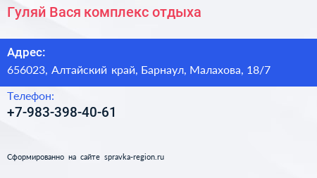 Гуляй Вася, комплекс отдыха по адресу 656023, Алтайский край, Барнаул, Малахова, 18/7 в дальнейшем Организация, размещена в следующих категориях:
