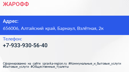 ЖАРОФФ по адресу 656006, Алтайский край, Барнаул, Взлётная, 2к в дальнейшем Организация, размещена в следующих категориях:
