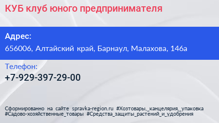 КУБ, клуб юного предпринимателя по адресу 656006, Алтайский край, Барнаул, Малахова, 146а в дальнейшем Организация, размещена в следующих категориях: