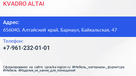 KVADRO ALTAI по адресу 656040, Алтайский край, Барнаул, Байкальская, 47 в дальнейшем Организация, размещена в следующих категориях: