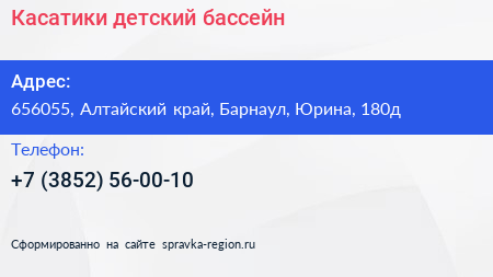 Касатики, детский бассейн по адресу 656055, Алтайский край, Барнаул, Юрина, 180д в дальнейшем Организация, размещена в следующих категориях: