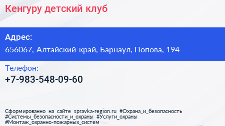 Кенгуру, детский клуб по адресу 656067, Алтайский край, Барнаул, Попова, 194 в дальнейшем Организация, размещена в следующих категориях:
