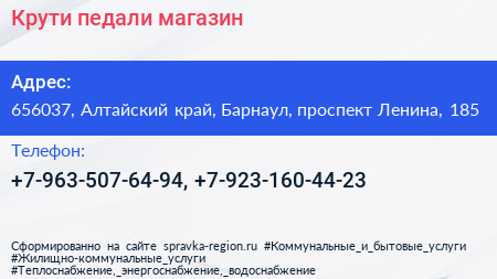 Крути педали, магазин по адресу 656037, Алтайский край, Барнаул, проспект Ленина, 185 в дальнейшем Организация, размещена в следующих категориях: