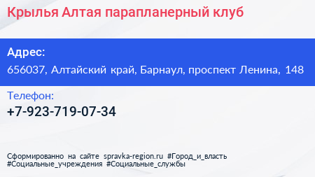 Крылья Алтая, парапланерный клуб по адресу 656037, Алтайский край, Барнаул, проспект Ленина, 148 в дальнейшем Организация, размещена в следующих категориях: