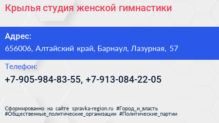 Крылья, студия женской гимнастики по адресу 656006, Алтайский край, Барнаул, Лазурная, 57 в дальнейшем Организация, размещена в следующих категориях: