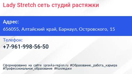 Lady Stretch, сеть студий растяжки по адресу 656055, Алтайский край, Барнаул, Островского, 15 в дальнейшем Организация, размещена в следующих категориях: