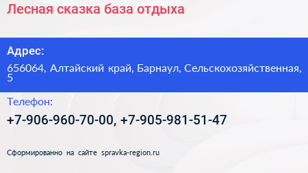 Лесная сказка, база отдыха по адресу 656064, Алтайский край, Барнаул, Сельскохозяйственная, 5 в дальнейшем Организация, размещена в следующих категориях: