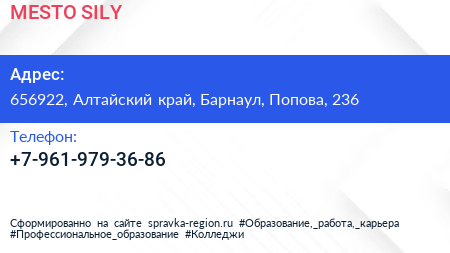 MESTO SILY по адресу 656922, Алтайский край, Барнаул, Попова, 236 в дальнейшем Организация, размещена в следующих категориях: