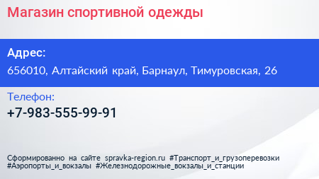 Магазин спортивной одежды по адресу 656010, Алтайский край, Барнаул, Тимуровская, 26 в дальнейшем Организация, размещена в следующих категориях: