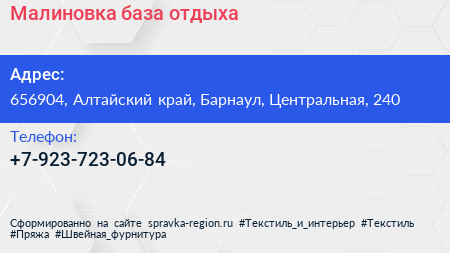 Малиновка, база отдыха по адресу 656904, Алтайский край, Барнаул, Центральная, 240 в дальнейшем Организация, размещена в следующих категориях: