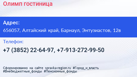 Олимп, гостиница по адресу 656057, Алтайский край, Барнаул, Энтузиастов, 12в в дальнейшем Организация, размещена в следующих категориях: