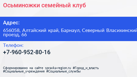 Осьминожки, семейный клуб по адресу 656058, Алтайский край, Барнаул, Северный Власихинский проезд, 66 в дальнейшем Организация, размещена в следующих категориях: