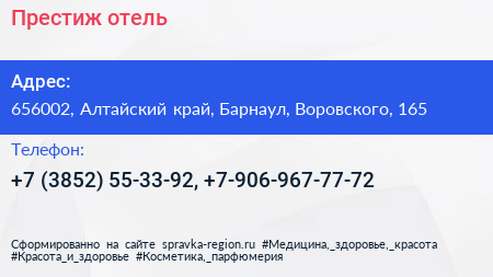 Престиж, отель по адресу 656002, Алтайский край, Барнаул, Воровского, 165 в дальнейшем Организация, размещена в следующих категориях: