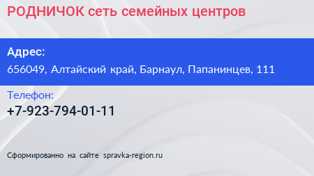 РОДНИЧОК, сеть семейных центров по адресу 656049, Алтайский край, Барнаул, Папанинцев, 111 в дальнейшем Организация, размещена в следующих категориях:
