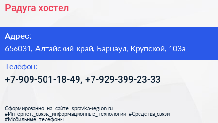 Радуга, хостел по адресу 656031, Алтайский край, Барнаул, Крупской, 103а в дальнейшем Организация, размещена в следующих категориях: