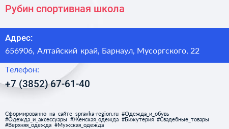 Рубин, спортивная школа по адресу 656906, Алтайский край, Барнаул, Мусоргского, 22 в дальнейшем Организация, размещена в следующих категориях: