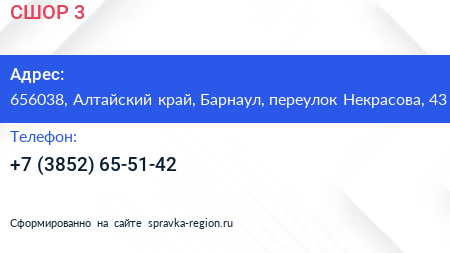 СШОР №3 по адресу 656038, Алтайский край, Барнаул, переулок Некрасова, 43 в дальнейшем Организация, размещена в следующих категориях: