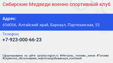 Сибирские Медведи, военно-спортивный клуб по адресу 656056, Алтайский край, Барнаул, Партизанская, 55 в дальнейшем Организация, размещена в следующих категориях: