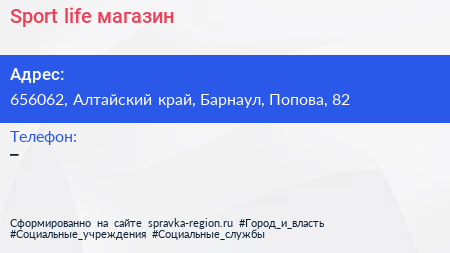 Sport life, магазин по адресу 656062, Алтайский край, Барнаул, Попова, 82 в дальнейшем Организация, размещена в следующих категориях: