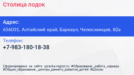 Столица лодок по адресу 656031, Алтайский край, Барнаул, Челюскинцев, 82а в дальнейшем Организация, размещена в следующих категориях:
