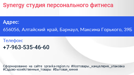 Synergy, студия персонального фитнеса по адресу 656056, Алтайский край, Барнаул, Максима Горького, 39Б в дальнейшем Организация, размещена в следующих категориях: