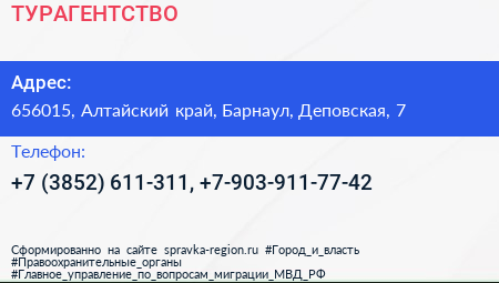 ТУРАГЕНТСТВО по адресу 656015, Алтайский край, Барнаул, Деповская, 7 в дальнейшем Организация, размещена в следующих категориях: