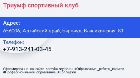 Триумф, спортивный клуб по адресу 656006, Алтайский край, Барнаул, Власихинская, 81 в дальнейшем Организация, размещена в следующих категориях: