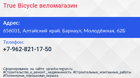 True Bicycle, веломагазин по адресу 656031, Алтайский край, Барнаул, Молодёжная, 62Б в дальнейшем Организация, размещена в следующих категориях: