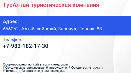 ТурАлтай, туристическая компания по адресу 656062, Алтайский край, Барнаул, Попова, 88 в дальнейшем Организация, размещена в следующих категориях: